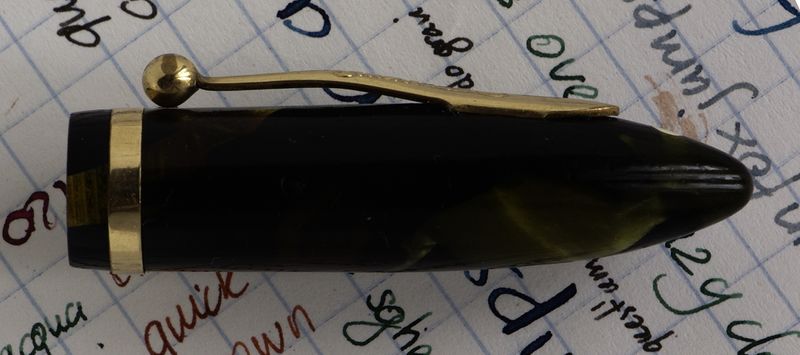 Photo of a pen produced by Sheaffer. Model: Balance. Filling system: lever filler. In green marbled (Marine green) celluloid. Detail of cap. Detail of clip. Small size (Petite), version with short section.