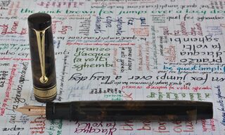 Photo of a pen produced by Simplex. Filling system: button filler. In marbled bronze celluloid. Big size model in Duofold style, marked Simplex Excelsior, very similar to the analogues produced by The King. Not original Rover nib.