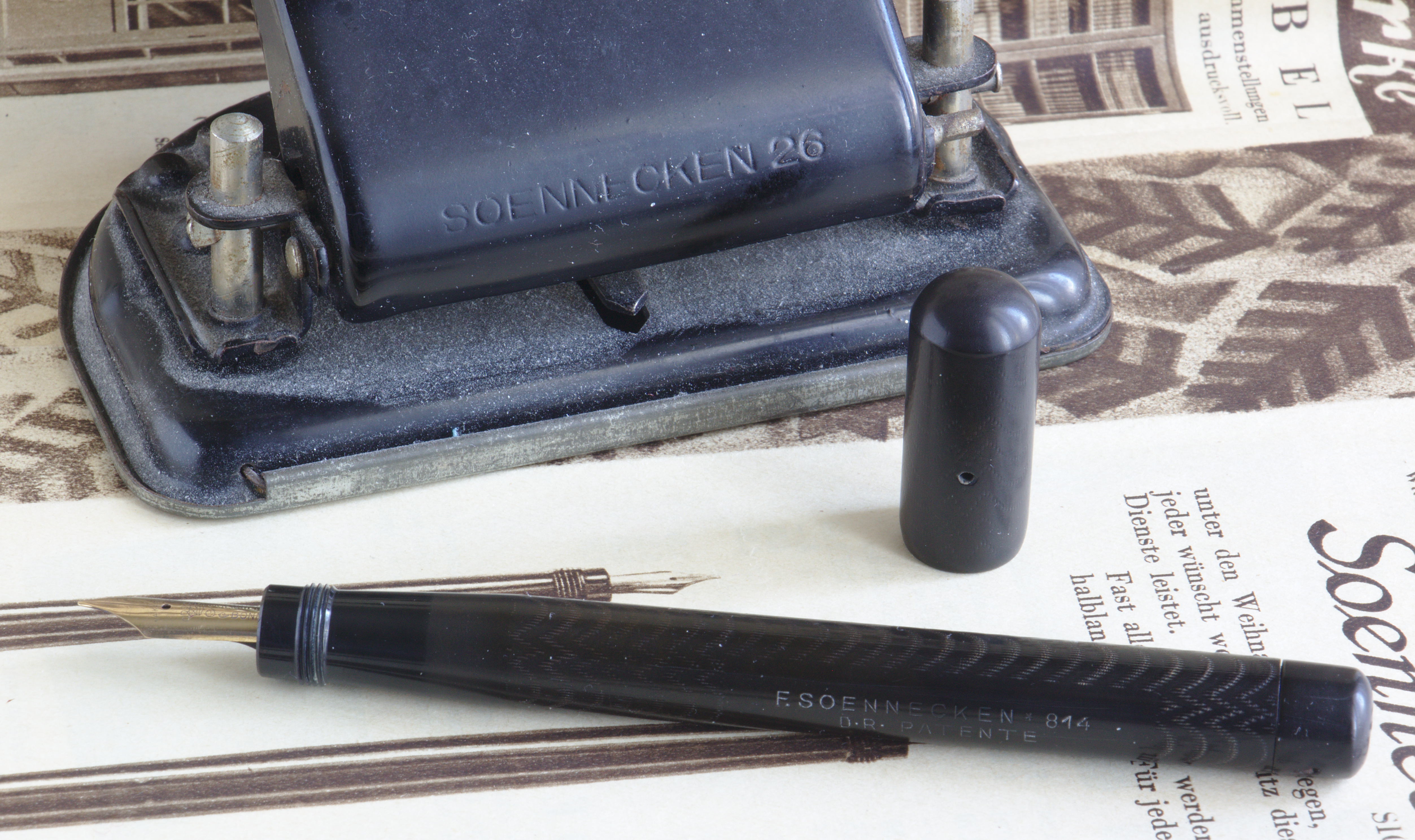 Foto di una penna Soennecken. Modello: Soennecken 814. Caricamento rientrante. Realizzazione in ebanite nera. Messa a disposizione da Fiocchetti (utente forum Fiocchetti).