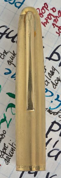 Foto di una penna Soffer. Caricamento a stantuffo. Realizzazione in celluloide trasparente a righe verdi. Dettaglio del cappuccio. Modello ignoto a pennino coperto con cappuccio laminato oro.