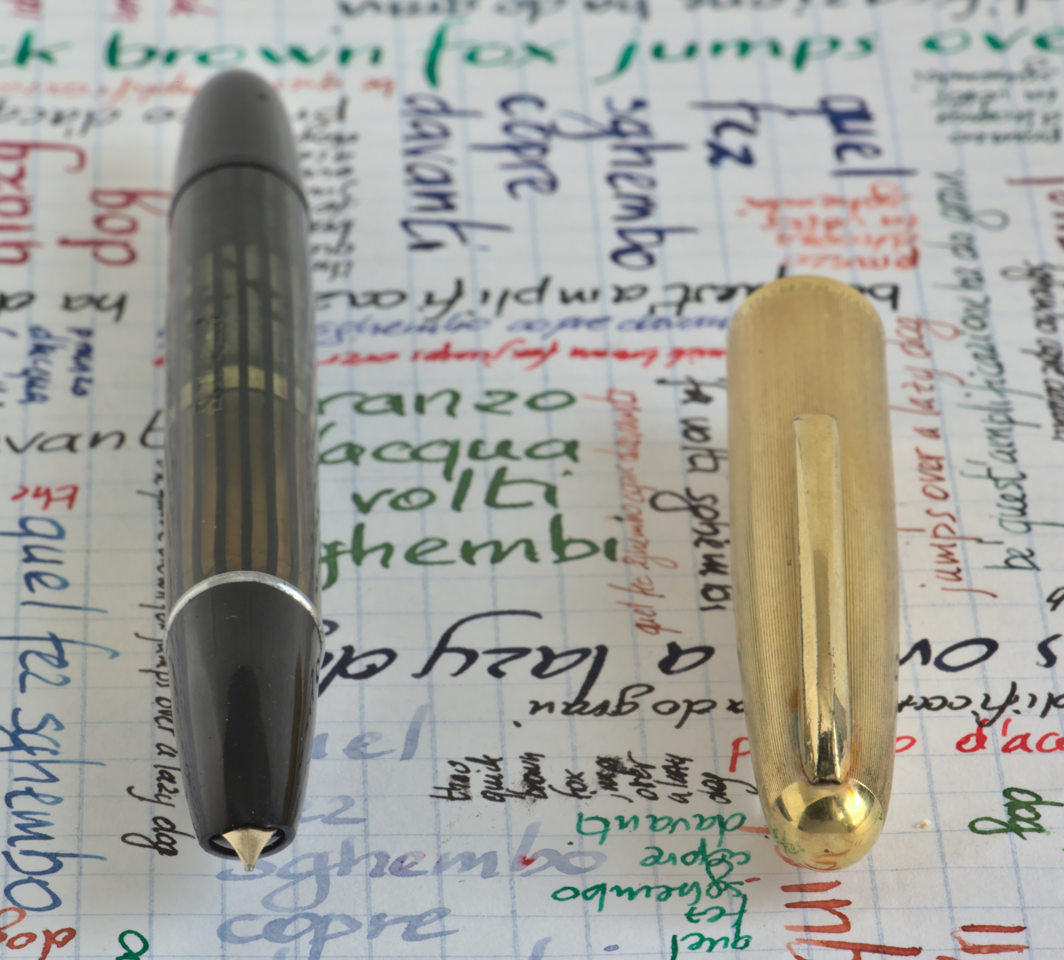 Foto di una penna Soffer. Caricamento a stantuffo. Realizzazione in celluloide trasparente a righe verdi. Modello ignoto a pennino coperto con cappuccio laminato oro.