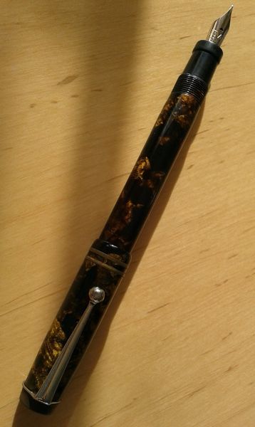 Foto di una penna Standard. Caricamento a pulsante di fondo. Realizzazione in celluloide nera e bronzo. Modello non identificato. Contributo di Giorgio (utente forum Musicus).