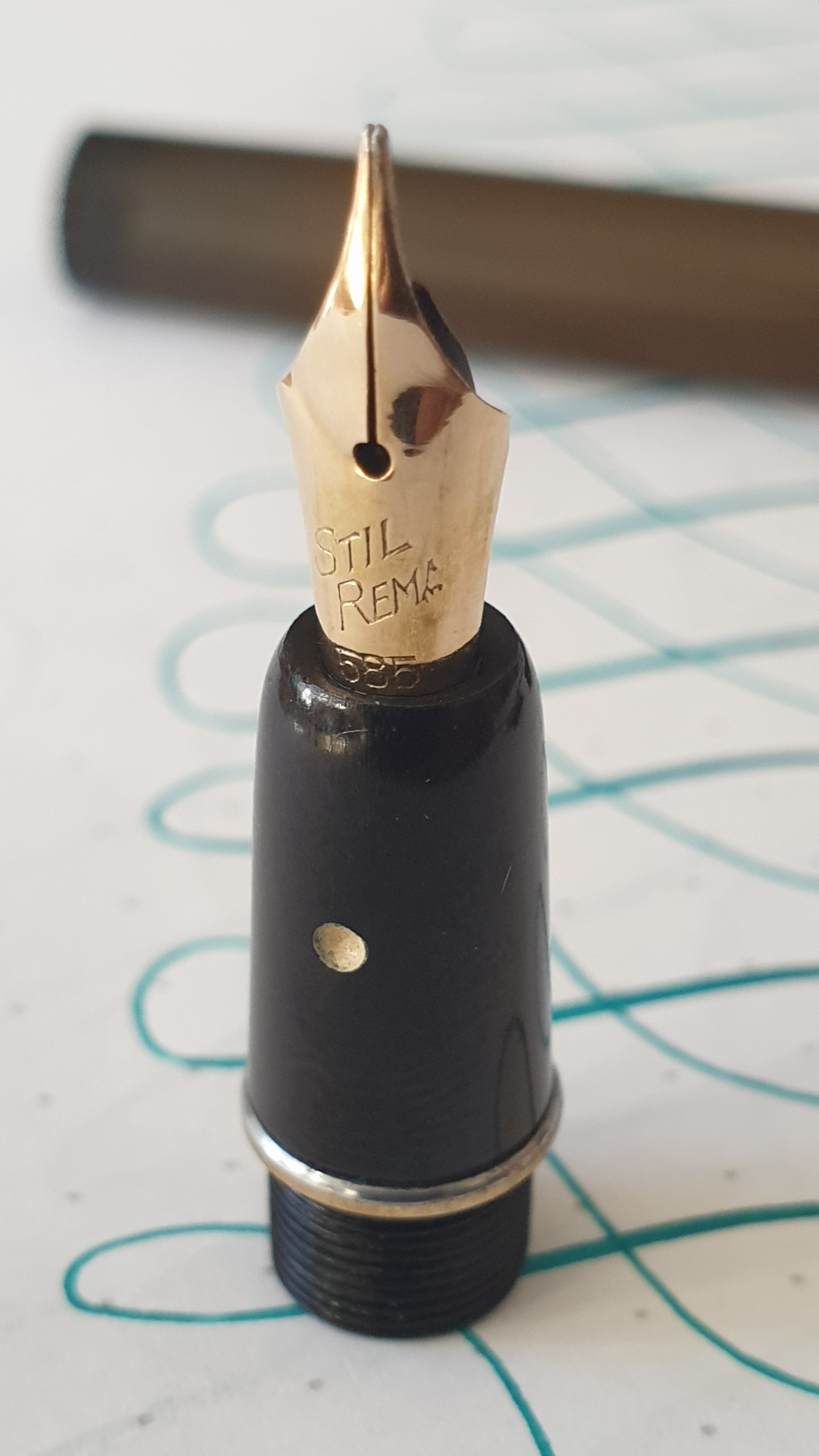 Foto di una penna Stil Re-Ma. Modello: Re-Ma 15890. Caricamento a stantuffo. Dettaglio del pennino. Modello con cappuccio in metallo dorato e fondello in galalite. Contributo di FlexNib.