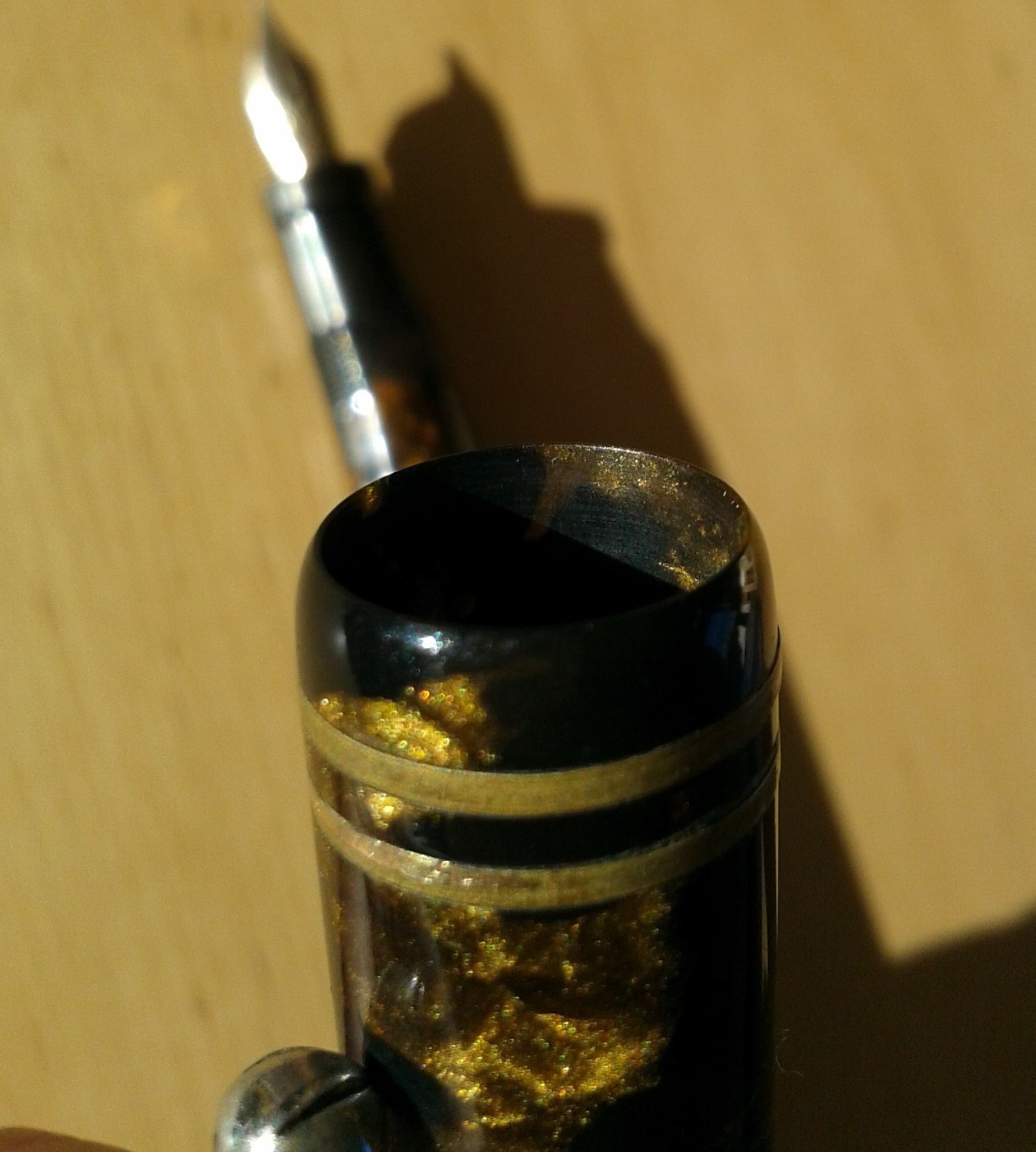 Foto di una penna Standard. Caricamento a pulsante di fondo. Realizzazione in celluloide nera e bronzo. Dettaglio del cappuccio. Dettaglio della veretta. Modello non identificato. Contributo di Giorgio (utente forum Musicus).