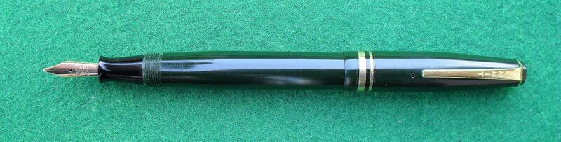 Foto di una penna Summit (un marchio della Lang - Curzon - Summit). Modello: Summit S.110. Caricamento a levetta. Realizzazione in celluloide nera. Nuova con adesivo. Contributo di Alberto (utente forum A Casirati).