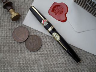 Foto di una penna Summit (un marchio della Lang - Curzon - Summit). Modello: Summit S.185. Caricamento a levetta. Realizzazione in celluloide nera cesellata. Completa di adesivi con il prezzo. Contributo di Alberto (utente forum A Casirati).