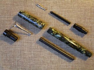 Photo of a pen produced by Summit (a Lang - Curzon - Summit trademark). Model: Summit Cadet. Filling system: lever filler. In marbled green celluloid. Economic model S.100, post WWII production (around 1946).