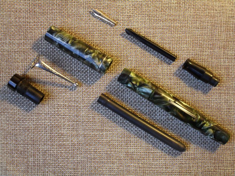Foto di una penna Summit (un marchio della Lang - Curzon - Summit). Modello: Summit Cadet. Caricamento a levetta. Realizzazione in celluloide marmorizzata verde. Modello economico S.100, produzione dell'immediato dopoguerra (1946 circa). Contributo di Alberto (utente forum A Casirati).