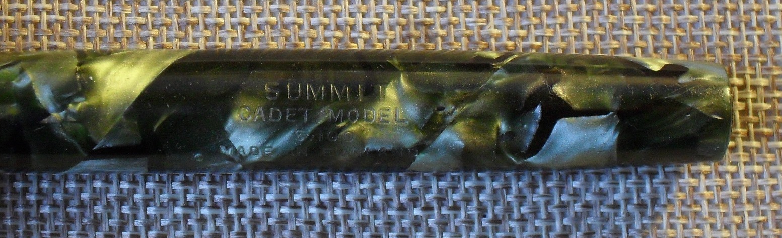 Foto di una penna Summit (un marchio della Lang - Curzon - Summit). Modello: Summit Cadet. Caricamento a levetta. Realizzazione in celluloide marmorizzata verde. Dettaglio della stampigliatura. Modello economico S.100, produzione dell'immediato dopoguerra (1946 circa). Contributo di Alberto (utente forum A Casirati).