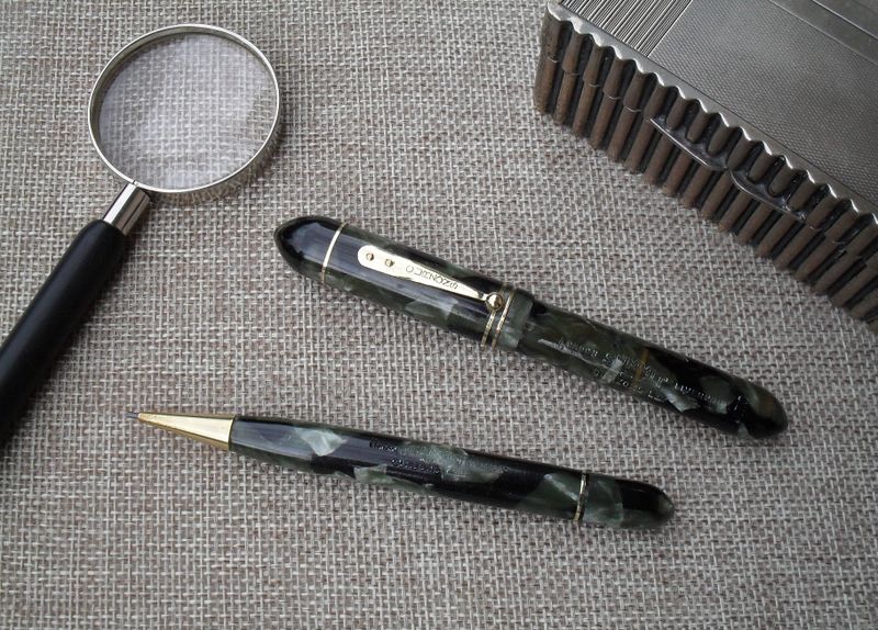 Photo of a pen/pencil set produced by Summit (a Lang - Curzon - Summit trademark). Model: Summit J.7.C. In green marbled celluloid. Vest pocket pen, with paired mechanical pencil.