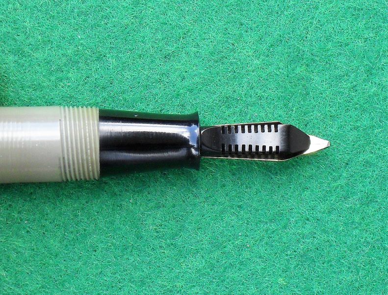 Foto di una penna Summit (un marchio della Lang - Curzon - Summit). Modello: Summit S.125. Caricamento a levetta. Realizzazione in celluloide grigia. Seconda versione (mk2), risalente a dopo della guerra. Contributo di Alberto (utente forum A Casirati).