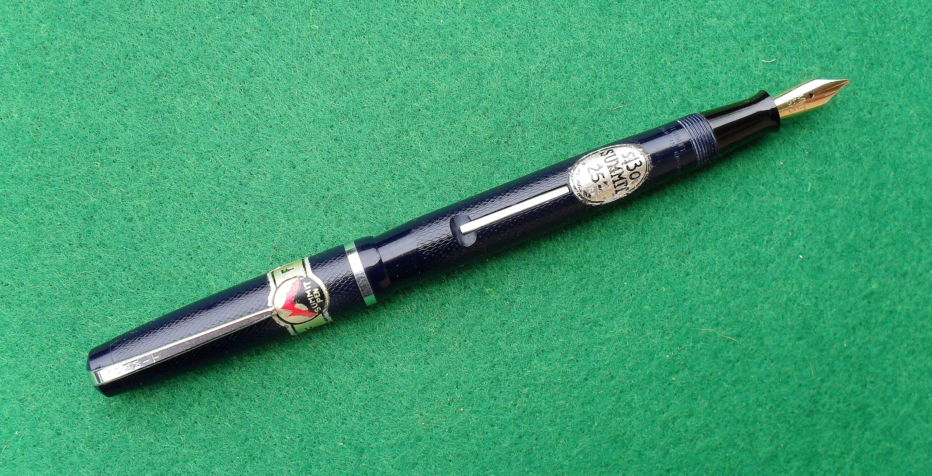 Foto di una penna Summit (un marchio della Lang - Curzon - Summit). Modello: Summit S.130. Caricamento a levetta. Realizzazione in celluloide blu notte cesellata. Completa di adesivi con il prezzo. Contributo di Alberto (utente forum A Casirati).