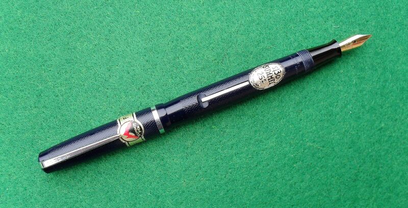 Photo of a pen produced by Summit (a Lang - Curzon - Summit trademark). Model: Summit S.130. Filling system: lever filler. In chased night blue celluloid. Complete of price stickers.
