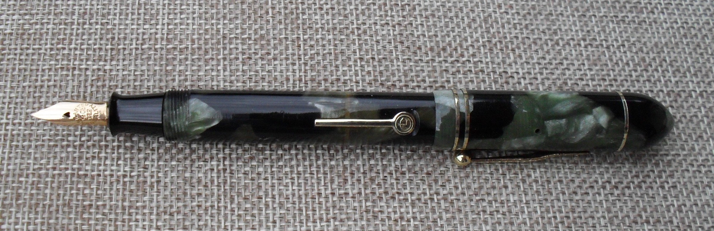 Photo of a pen produced by Summit (a Lang - Curzon - Summit trademark). Model: Summit J.7.C. In green marbled celluloid. Vest pocket pen, with paired mechanical pencil.