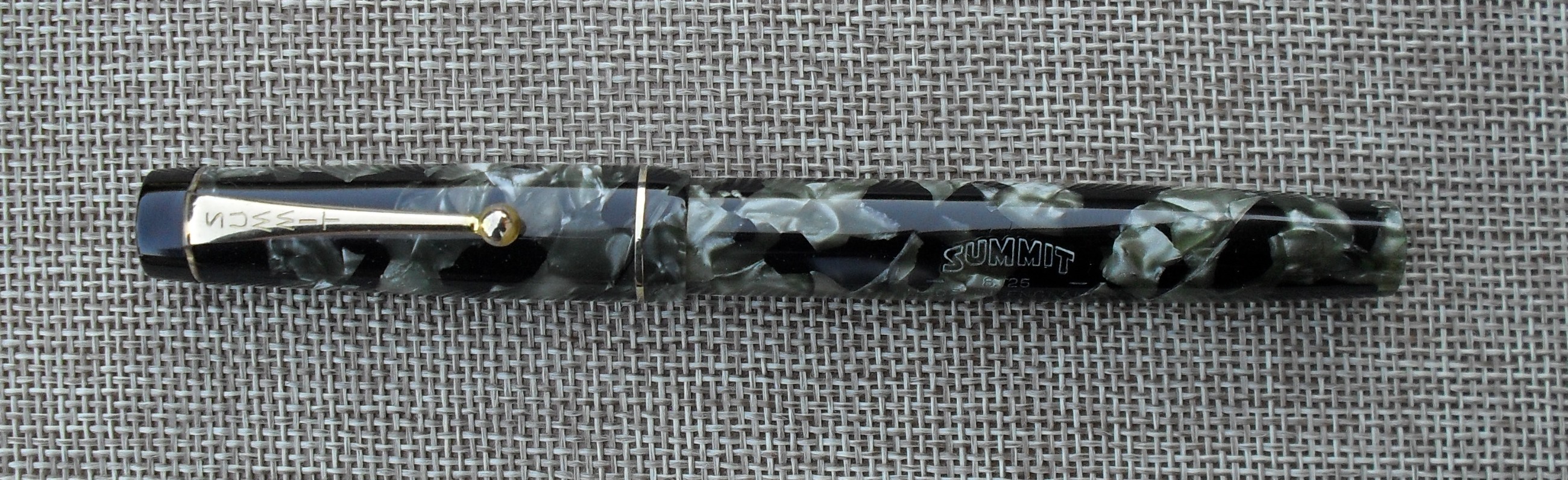 Photo of a pen produced by Summit (a Lang - Curzon - Summit trademark). Model: Summit S.125. Filling system: lever filler. In marbled green celluloid. First version (mk1), pre WWII production.