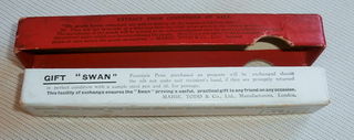 Foto di una confezione Swan. Modello: Swan L 212. Caricamento "Leverless". Realizzazione in celluloide nera. Modello marcato L212/60. Riporta stampigliatura del brevetto nº GB-390585. Contributo di Fabrizio Falchi, (utente forum fountainpen.it fab66).