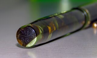 Photo of a pen produced by Swan. Model: Swan SM 2. Filling system: lever filler. In green bronze marbled celluloid. Detail of bottom. Numbered SM2/58 (nib #2, color code 58), hard rubber lever.