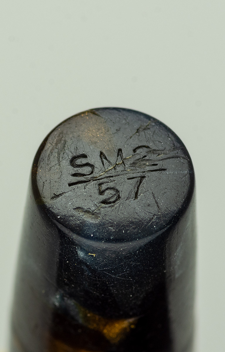 Foto di una penna Swan. Modello: Swan SM 2. Caricamento a levetta. Realizzazione in celluloide marmorizzata blu e bronzo. Dettaglio del fondo. Dettaglio della numerazione. Numerata SM2/57 (pennino #2, codice colore 57), levetta in ebanite. Contributo di Edo (utente forum edo68).