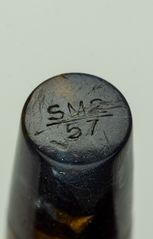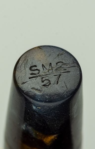 Photo of a pen produced by Swan. Model: Swan SM 2. Filling system: lever filler. In blue bronze marbled celluloid. Detail of bottom. Detail of numeration. Numbered SM2/57 (nib #2, color code 57), hard rubber lever.