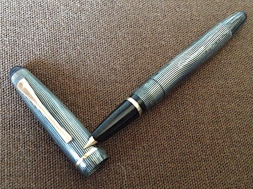 Foto di una penna Surgens. Caricamento a pulsante di fondo. Realizzazione in celluloide a linee verde acqua. Modello ignoto. Contributo di Paolo (utente forum PG1964TO).