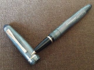 Photo of a pen produced by Surgens. Filling system: button filler. In green water lined celluloid. Unknown model.