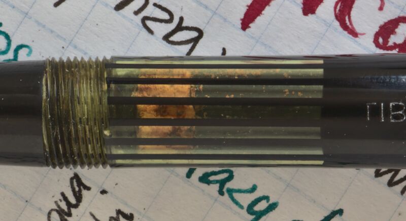 Foto di una penna Tibaldi. Modello: Tibaldi Trasp.M. Caricamento a stantuffo. Realizzazione in celluloide nera. Dettaglio del caricamento. Modello con pennino carenato, marcata "D-2333".