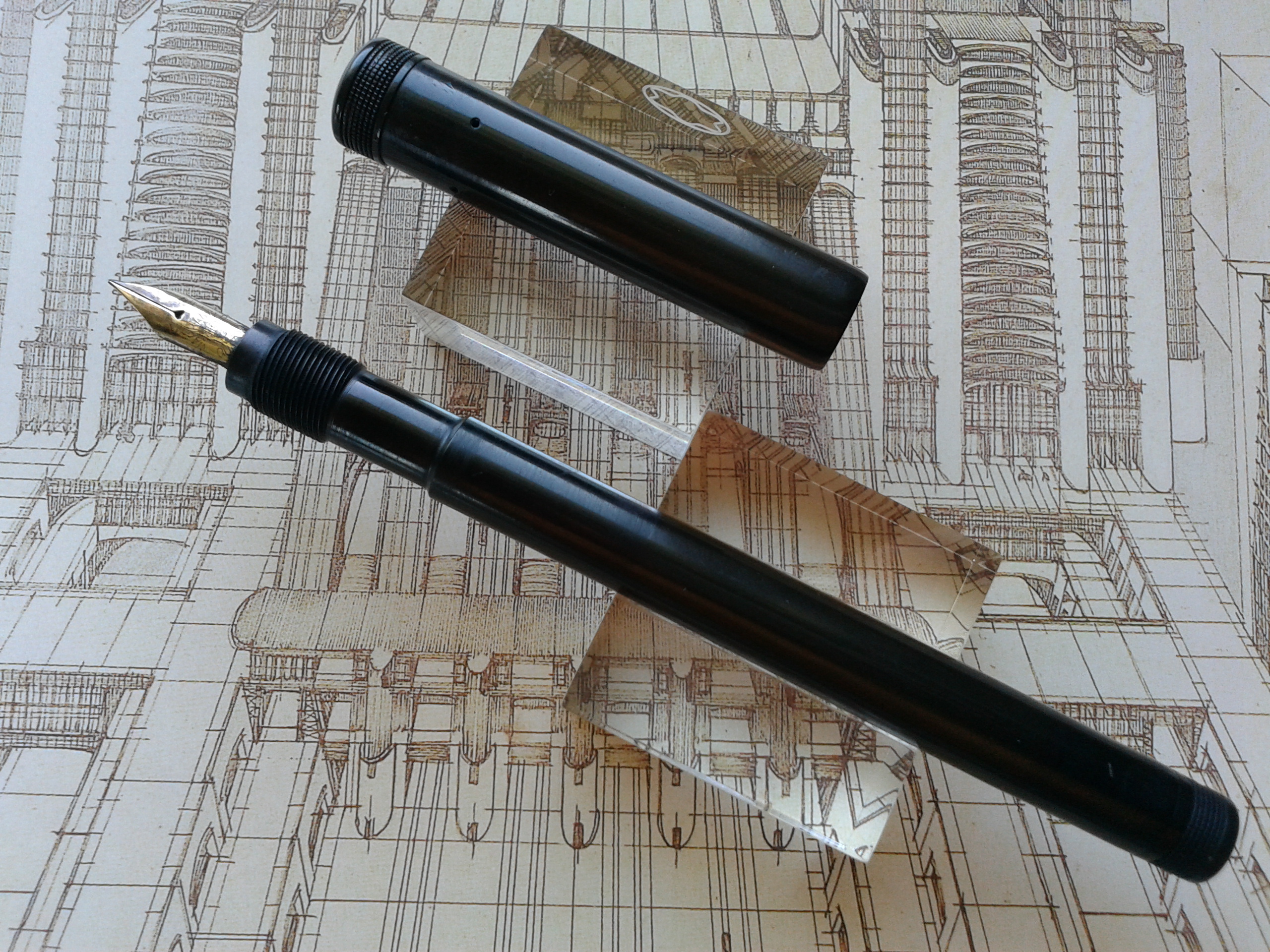 Foto di una penna Tibaldi. Modello: Perfecta. Caricamento a torsione. Realizzazione in ebanite nera. Misura marcata N. 12. Contributo di Giorgio (utente forum Musicus).