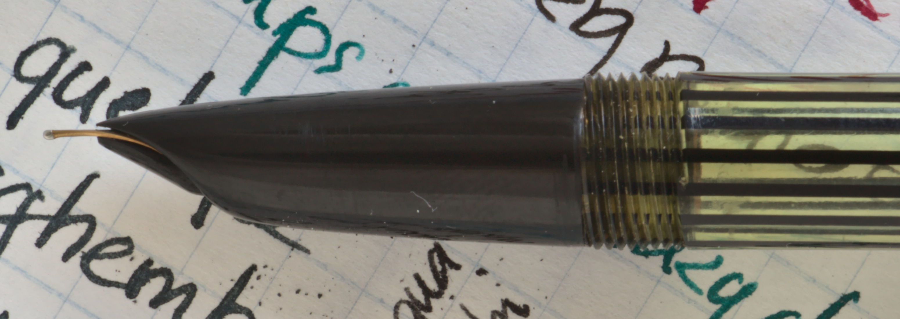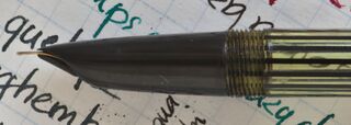 Foto di una penna Tibaldi. Modello: Tibaldi Trasp.M. Caricamento a stantuffo. Realizzazione in celluloide nera. Dettaglio del pennino. Dettaglio dell'alimentatore. Modello con pennino carenato, marcata "D-2333".