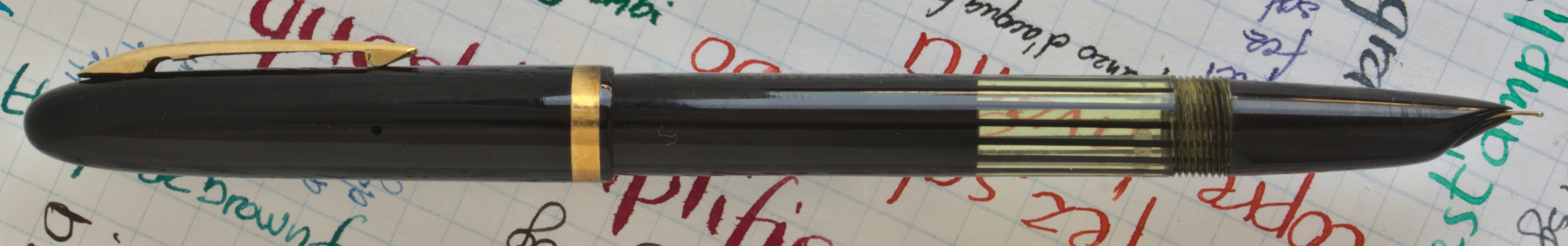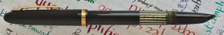 Foto di una penna Tibaldi. Modello: Tibaldi Trasp.M. Caricamento a stantuffo. Realizzazione in celluloide nera. Modello con pennino carenato, marcata "D-2333".