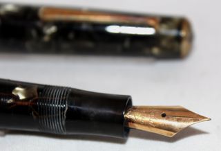 Photo of a pen produced by Tibaldi. Model: Tibaldi Mod. 60. Filling system: vacumatic-like. In marbled green celluloid. Courtesy of Marco Vanzi. Photographed at 2012 Florence Pen Show.
