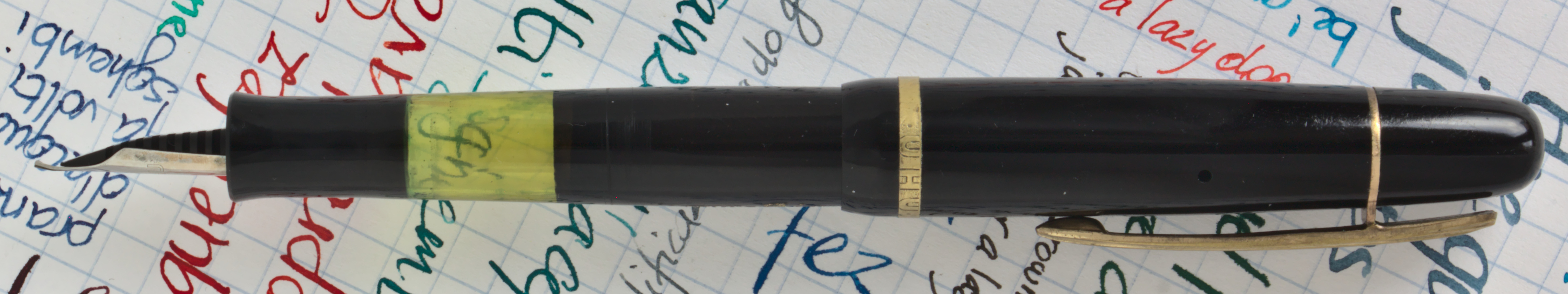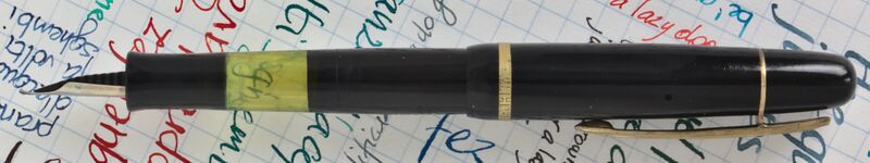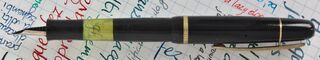 Photo of a pen produced by Uhu. Model: UHU-Primus. Filling system: piston filler. In black plastic resin. Peculiar cap closing on section internal, no barrel threading.
