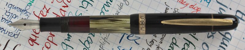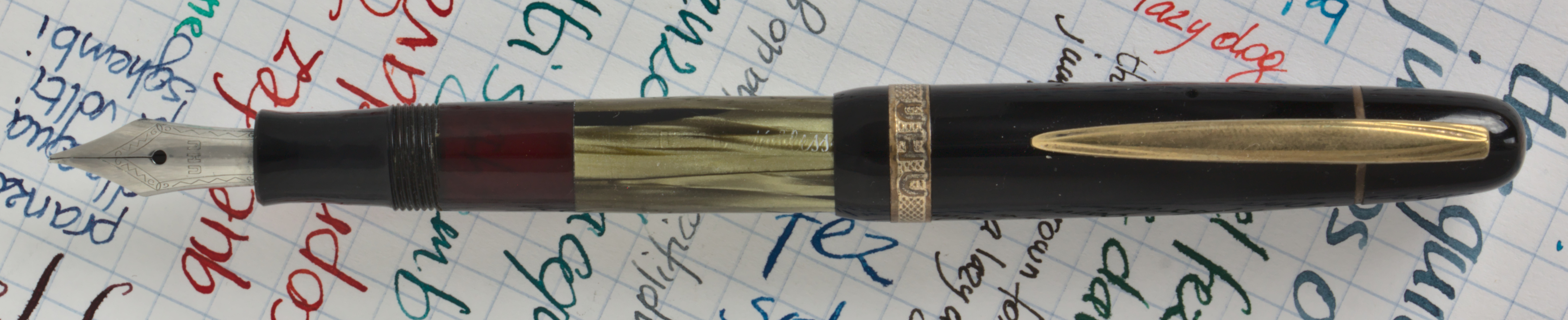Foto di una penna Uhu. Modello: UHU-Noblesse. Caricamento a stantuffo. Realizzazione in celluloide striata bruna. Pennino misura M, indicato sul fondo del fusto.