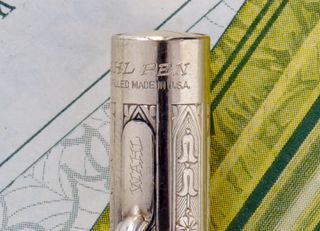 Foto di una penna Eversharp. Modello: Wahl Metal Pen. Caricamento a levetta. Realizzazione in metallo laminato oro con lavorazione guilloché. Dettaglio della stampigliatura. Misura lunga, nella lavorazione Console.