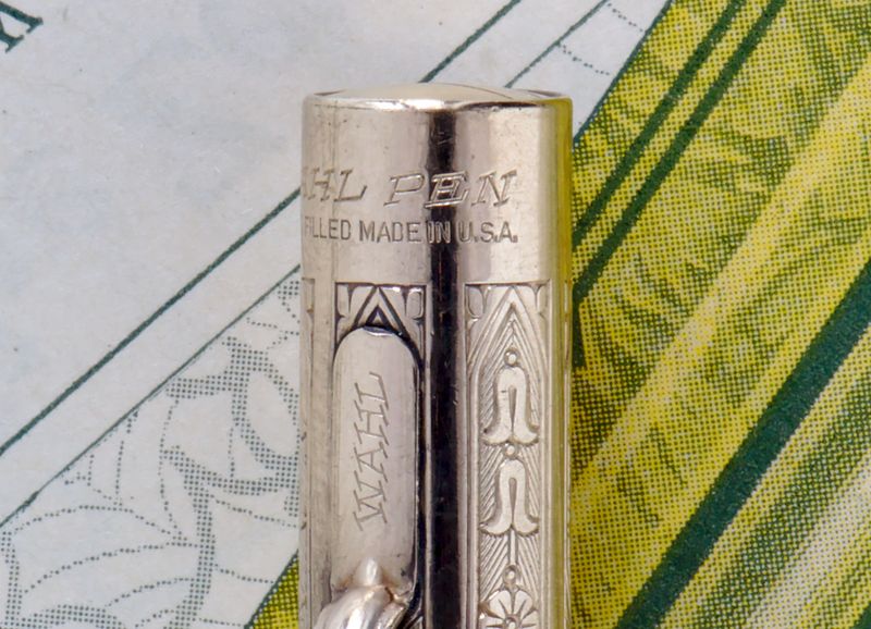 Photo of a pen produced by Eversharp. Model: Wahl Metal Pen. Filling system: lever filler. In engine turned gold filled metal. Detail of inscription. Long size, in the Console pattern.
