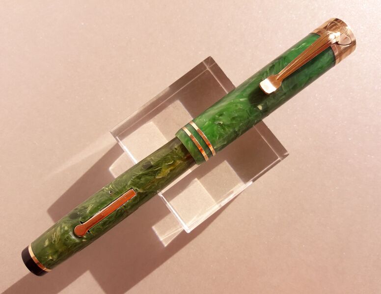 Foto di una penna Eversharp. Modello: Tulip Clip. Caricamento a levetta. Realizzazione in celluloide jade green. Misura piccola, pennino n. 2. Contributo di Giorgio (utente forum Musicus).