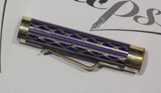Foto di una penna Eversharp. Modello: Wahl Metal Pen. Caricamento a levetta. Realizzazione in metallo laminato oro con lavorazione guilloché e smalto blu. Dettaglio del cappuccio. Misura media, nella lavorazione New Lakeside. Messa a disposizione da Cliff Harrington. Fotografata al Pen Show di Bologna del 2018.