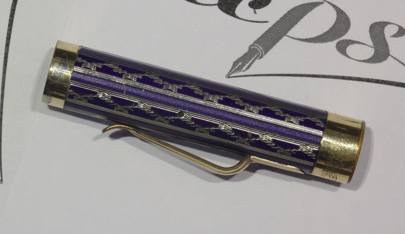 Photo of a pen produced by Eversharp. Model: Wahl Metal Pen. Filling system: lever filler. In blue enameled engine turned gold filled metal. Detail of cap. Medium size, in the New Lakeside pattern. Courtesy of Cliff Harrington. Photographed at 2018 Bologna Pen Show.