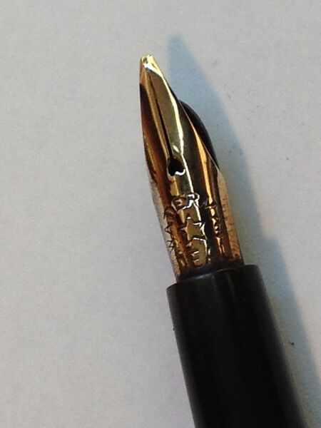 Photo of a pen produced by Waterman. Model: Waterman 12. An eyedropper filler. With openwork sterling silver overlay. Detail of nib. With a rare star imprinted nib.