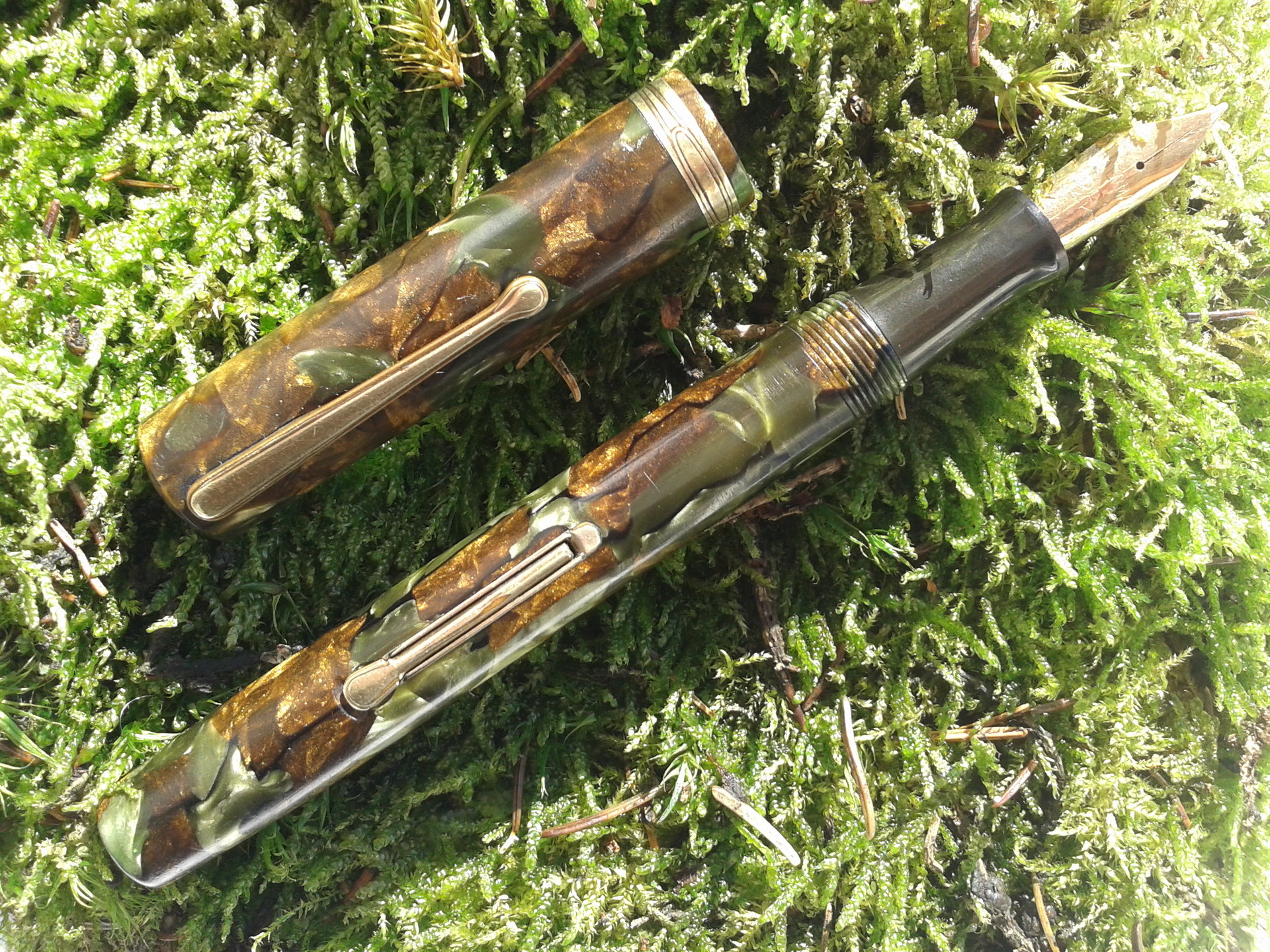 Foto di una penna Waterman. Modello: Waterman 94. Caricamento a levetta. Realizzazione in celluloide marmorizzata verde/bronzo. Nel colore denominato "Moss Agathe". Contributo di Giorgio (utente forum Musicus).