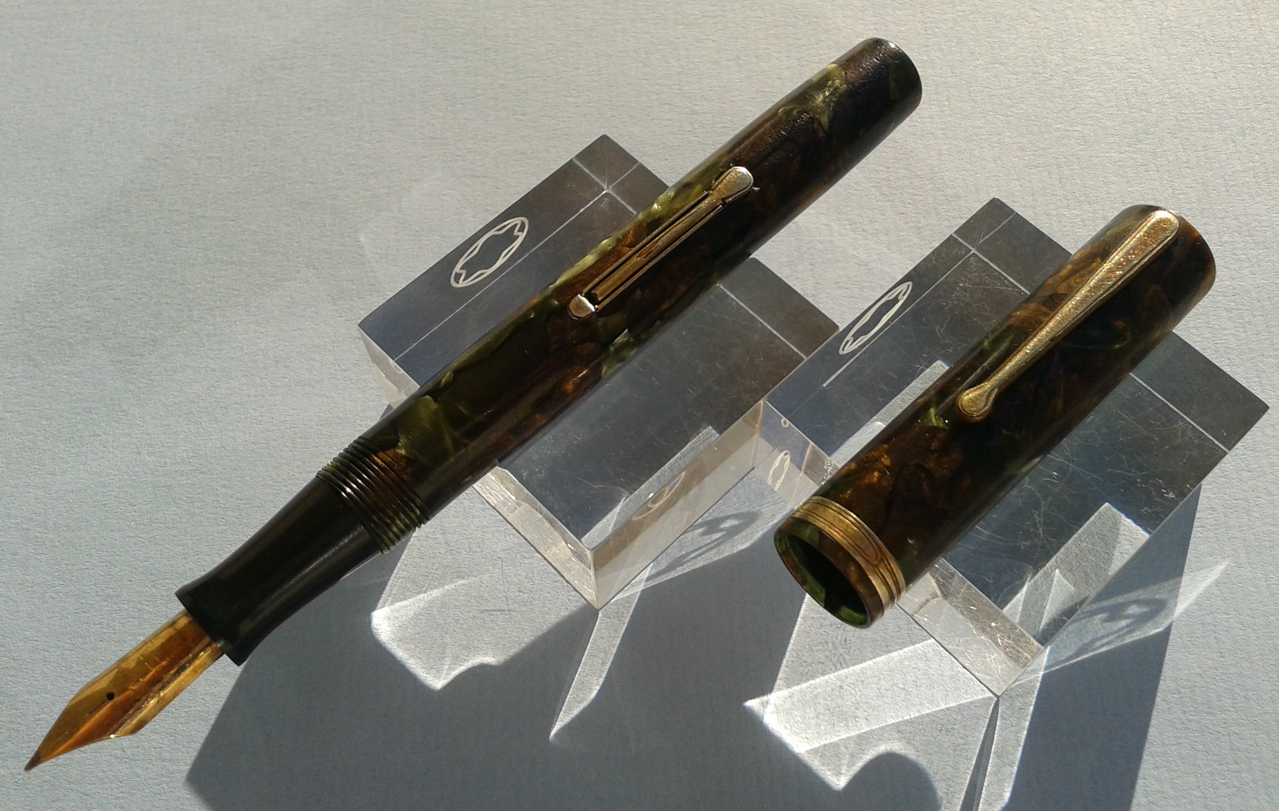 Photo of a pen produced by Waterman. Model: Waterman 94. Filling system: lever filler. In marbled green/bronze celluloid. In the color named "Moss Agathe".