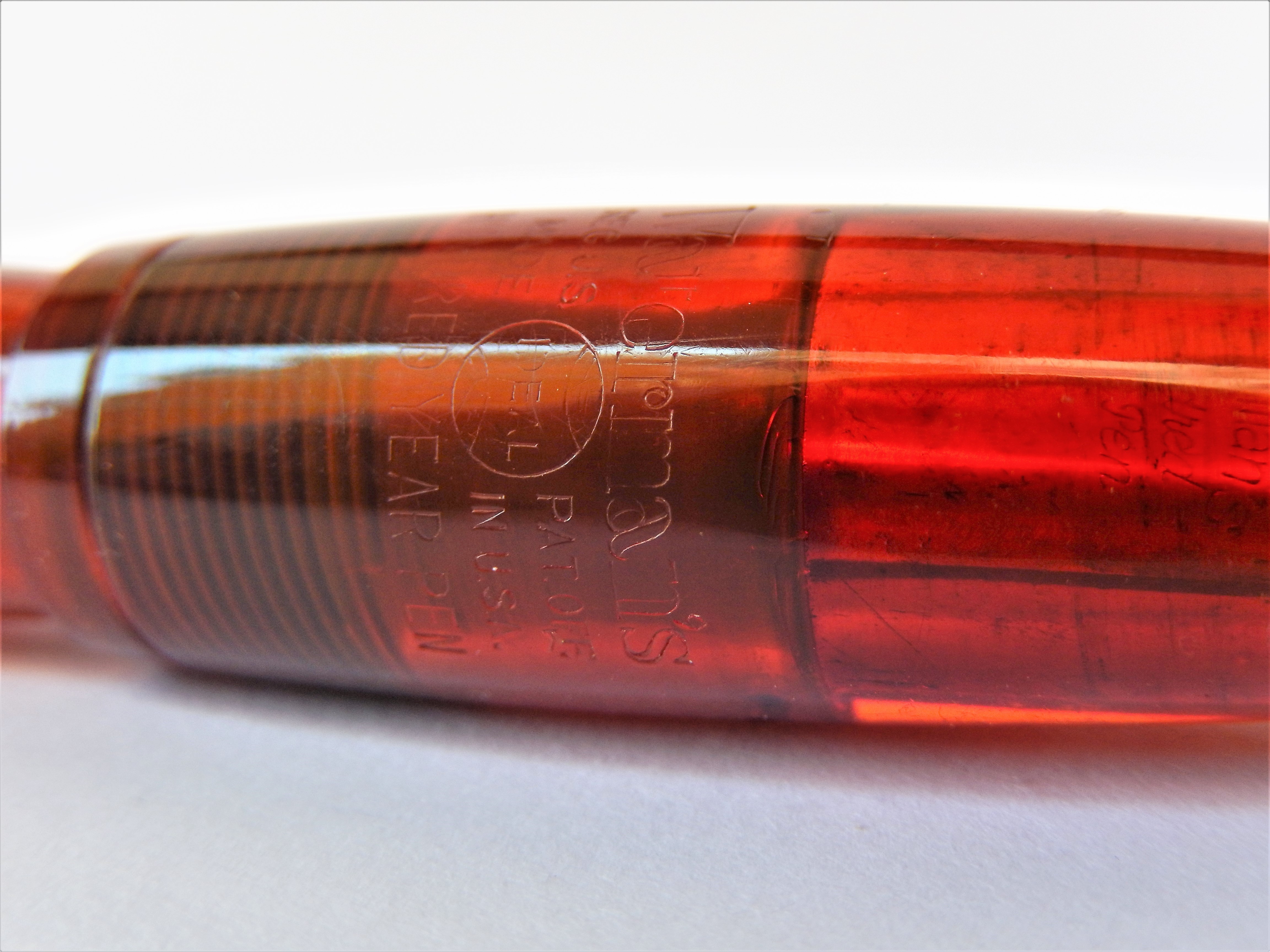 Photo of a pen produced by Waterman. Model: Hundred Year. Filling system: lever filler. In transparent red lucite. Detail of inscription. Second year version standard size: barrel band, flattened cap head, straight and transparent barrel.