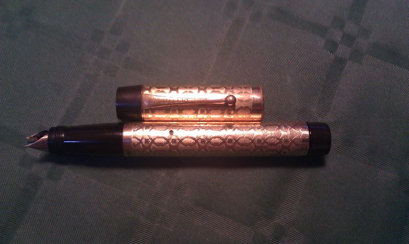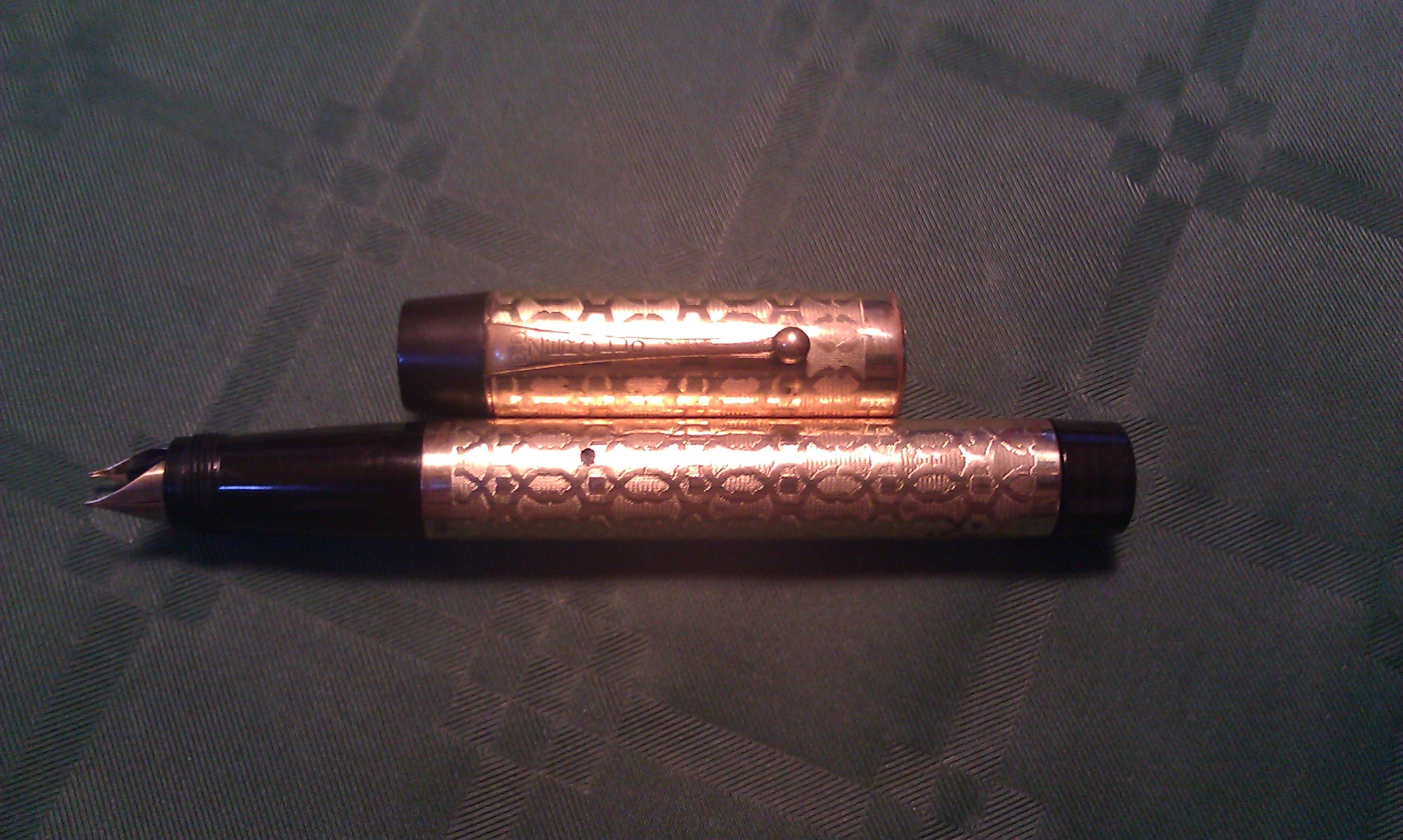 Photo of a pen produced by Zerollo. With gold rolled overlay. Photographed at 2011 Rome Pen Show.