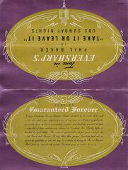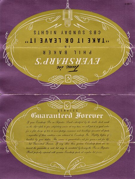Scansione di un foglietto di istruzioni Eversharp degli anni '40. Relativo ad un modello Skyline. Fronte. Sull'altro lato di File:IstruzioniSkyline-back.jpg. Contiene il riferimento alla trasmissione radio Take it or leave it sponsorizzata dalla Eversharp. Ritoccata dall'autore per una migliore nitidezza. Da una confezione originale.