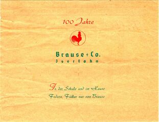 Scanning of a Brause instruction sheet from 1950. Filling instructions for a piston model. Back side celebrating the 100 year anniversary, dating it to 1950. On the other side of File:Brause-Piston-Instro-1950-Front.jpg. Contributed by David Parisi (utente forum pencilator).