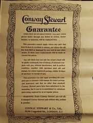 Scanning of a Conway Stewart a warranty from '30s. For a Conway Stewart 85L model. Mention as address: "36/44 Copperfield Rd., London, E.3". Front. On the other side of File:Conway-85L-Istruzioni-Retro.jpg. Retouched by the author for a better sharpness. From an original package.