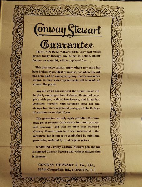 Scansione di un foglietto di garanzia della Conway Stewart |
