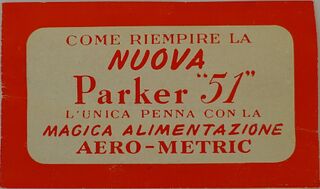 Scansione di un foglietto di istruzioni Parker degli anni '50. Relativo ad un modello Parker 51. Fronte, intestazione. Menziona l'Aero-metric. Sull'altro lato di File:Parker-51-Istruzioni-Interno.jpg. Contributo di Linos (utente forum Linos). Da una confezione originale.