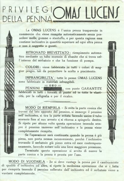 Scansione di un foglietto di istruzioni Omas degli anni '40. Relativo ad un modello Lucens. Istruzioni per il caricamento a stantuffo tuffante. Contributo di Roberto Vetrugno (utente forum.fountainpen.it roberto v). Da una confezione originale.