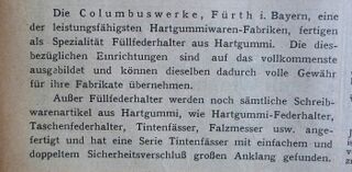 Scansione di una pubblicità datata 1909. Pubblicazione su: Der Papierhändler - Fachblatt Schreibwaren für Papier u. Büro-Bedarf. Contributo di Tom Westerich, https://www.penboard.de. Data ottenuta da quella di pubblicazione del volume da cui la pagina è estratta. Pubblicità redazionale in forma di notizia sulla produzione di stilografiche ed oggetti in ebanite della Columbus-Werke.
