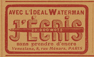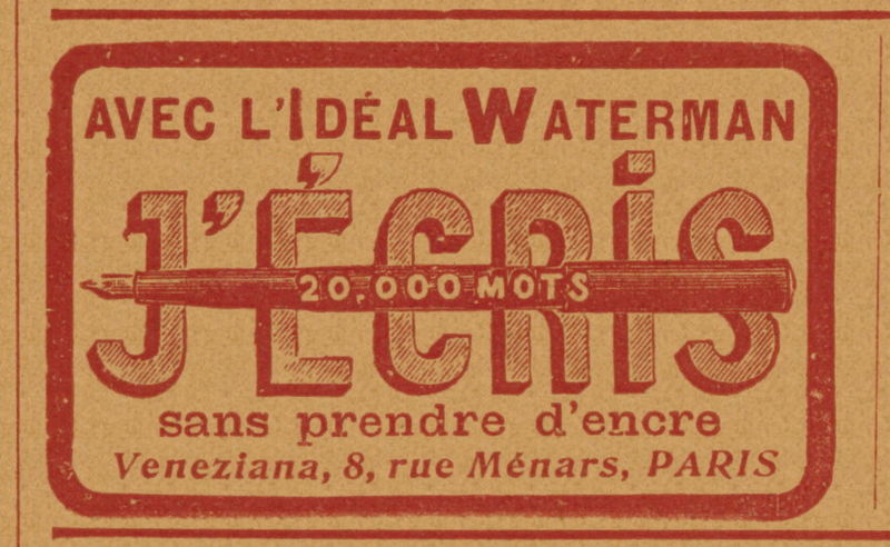 Scansione di una pubblicità Waterman datata 1905-09-23. Pubblicazione su: L'Illustration, anno 63, n. 3265. Ritoccata dall'autore per una migliore nitidezza. Data dal reperimento della pagina su una versione archiviata della rivista. Pubblicità generica della marca. Diverso concessionario rispetto alle analoghe File:1905-07-Waterman-1x.jpg e File:1905-10-Waterman-1x.jpg. Una versione identica (a parte il nome "VENEZIANI" del concessionari) è pubblicata sul N. 3358 (1907-07-06).